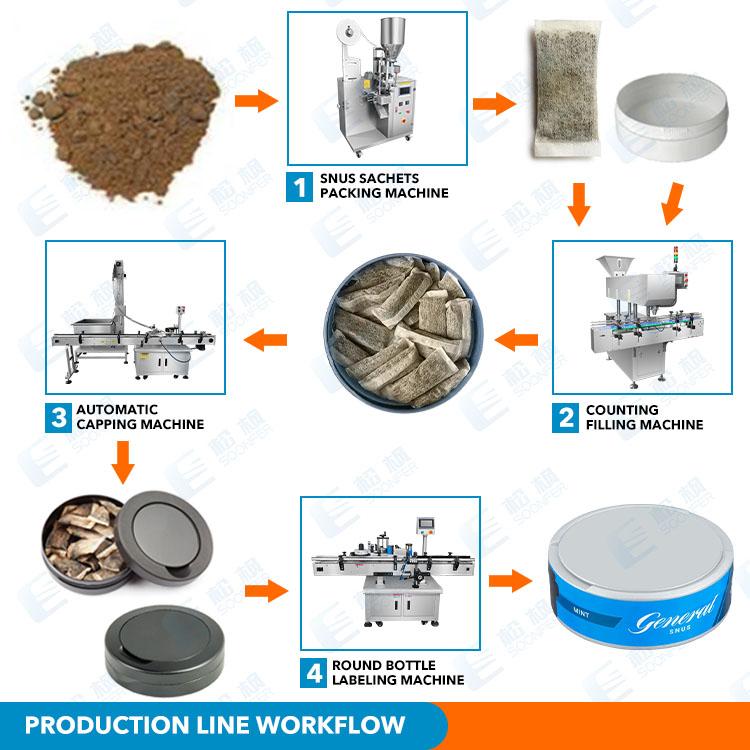 The snus filling and packaging line is designed for the automatic packaging and secondary processing of snus powder products. The line mainly consists of snus sachet packing machines (multiple units can be used for higher capacity), sachet counting and box filling machine, capping machine, round bottle labeling machine, top and bottom labeling machine, and heat shrink packaging machine. The system integrates sachet packaging, counting, container filling, capping, labeling, and shrink wrapping into one automated production line, providing an efficient and hygienic solution for various types of snus powder products.