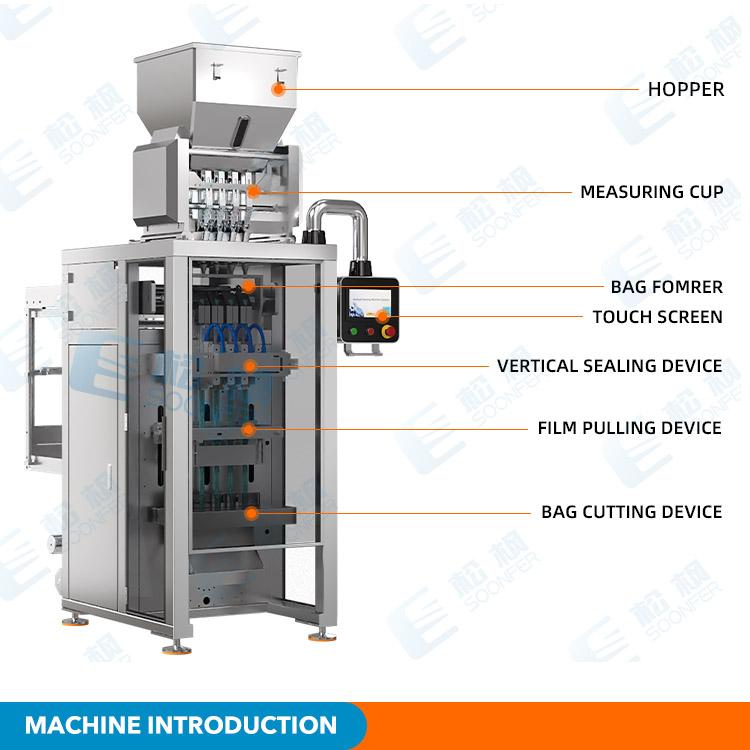 The multi lane granule packing machine is designed for high-speed and accurate packaging of granular products such as sugar, salt, seeds, and coffee. It features a multi-lane structure to significantly boost production efficiency, while ensuring consistent filling through precise measuring systems. The machine integrates automatic film unwinding, bag forming, filling, sealing, and cutting in one continuous process, delivering stable performance and reliable packaging quality.